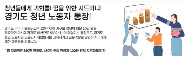 매달 10만 원을 저축하면 2년 만기 시 최대 580만 원을 돌려받는 경기도 청년을 위한 '경기도 청년 노동자 통장'이 출시되었는데요, 혜택이 큰 경기도 청년 노동자 통장 신청자격요건과 신청방법에 대해 빠르게 정리해 보겠습니다.