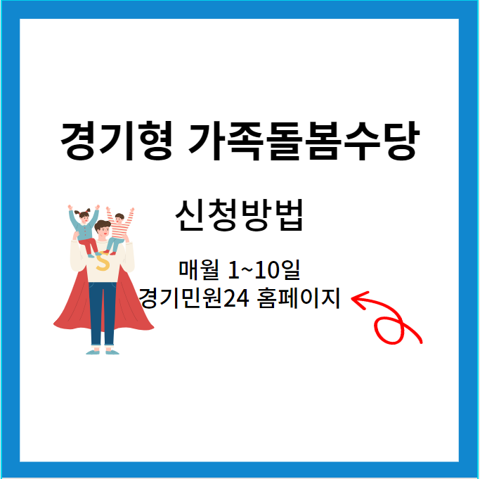 경기형 가족돌봄수당은 매월 1~10일까지 아래 경기민원24 공식 홈페이지를 통해서 온라인 신청이 가능합니다. (신청은 양육자 (부 또는 모)만 신청할 수 있습니다.)