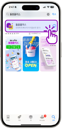 - 구글 플레이스토어 또는 애플 앱스토어에서 '돌봄플러스' 앱을 다운로드합니다.