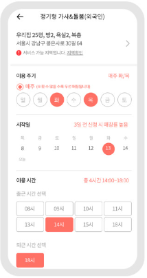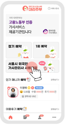 서비스 제공기관인 (주)홈스토리생활(대리주부) 또는 (주)휴브리스(돌봄 플러스) '모바일 앱'에서 회원가입 후 '서울시 외국인 가사관리사 시범사업'을 클릭해 24시간 신청할 수 있습니다.