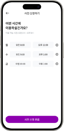 - 이용 주기, 시작일, 이용시간을 선택하면 신청 완료입니다.