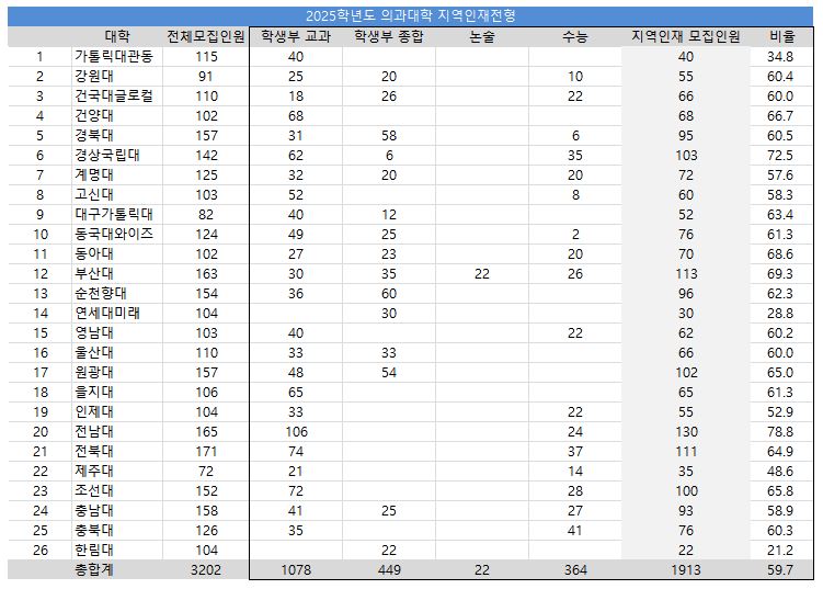 2025학년도 의대 지역인재전형 모집인원 확정 발표 자료에 따르면 비수도권 모집인원의 59.7%인 1913명을 지역인재전형으로 선발합니다.
