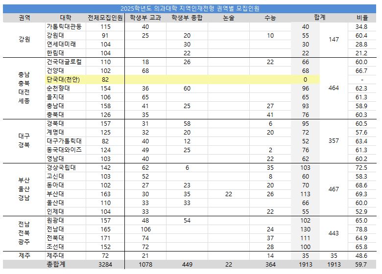 2025학년도 의대 지역인재전형 권역별 모집인원